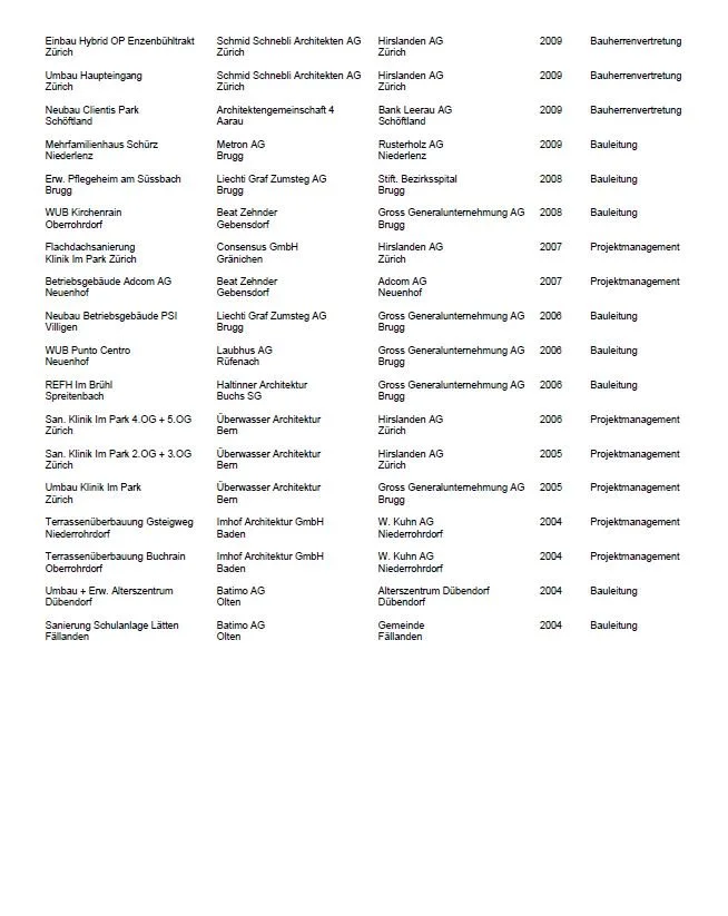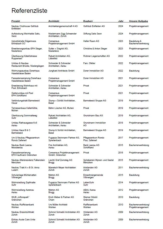 Auszug aus unseren Referenzen Neubau Clubhouse Golfclub Entfelden Aufstockung Weinhalde Satis, Seon Neubau Industriehalle Dägermoos, Erlinsbach SO Rotodur AG, Gränichen Provisorium Golfrestaurant, Golfclub Entfelden Hotel Krone Lenzburg - Küchenumbau EFH Steger, Niederlenz Überbauung Käterlistrasse, Rupperswil Umbau + Erweiterung Restaurant Brücke, Niedergösgen Wohnungsausbau + Fassadensanierung Dorerhaus, Baden Erweiterung Wohnhaus & Neubau Pool, Erlinsbach Sanierung Haus B, Klinik Barmelweid Neubau Oscar, Klinik Barmelweid Terrassenhaus Kellerhöhle, Muhen Umbau Haus B&C Klinik Barmelweid Umbau Rathausgasse 6&8, Aarau Neubau Überbauung Sonnmattweg, Suhr Neu- & Umbau Alters- und Pflegezentrum Rondo, Safenwil Neubau Schulanlage Mühlematten, Villmergen Neubau Bank Leerau, Kirchleerau Neubau Altersresidenz Falkenstein, Menziken Wohnsiedlung Zopfmatte, Suhr Wohnsiedlung Aarenau Baufeld 4, Aarau Neubau Raiffeisenbank Wohlen Clientis Park, Schöftland Gesamte Referenzliste Träumen. Gestalten. Wachsen. Verkaufen.